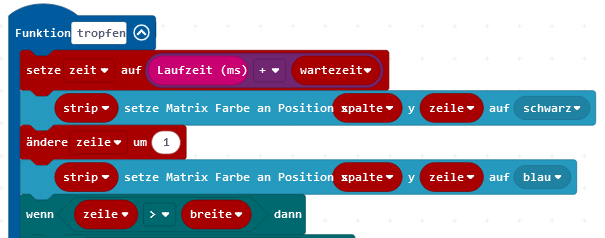 Das Programm ist fertig: Die Tropfen werden immer schneller und ändern ihre Farbe, je schneller sie werden (von Blau zu Rot). Die Eimerfarbe zeigt an, ob ein Tropfen gefangen wurde. Auf dem 5x5-Bildschirm wird durch einen CountDown die verbleibenden Spielzeit angezeigt. Mit der Taste A kann das Spiel neu gestartet werden und mit der Taste B werden die in der Spielzeit gefangenen Tropfen angezeigt.