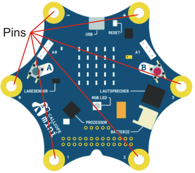 Die Sensoren: Der Calliope mini hat 6 Anschlüsse, die Pins genannt werden. Jeder Pin hat eine Bezeichnung. Die oberen beiden heißen + und -. Die anderen sind von 0 bis 3 durchnummeriert. Die Pins sind einfache Eingabestellen unseres Computers und können von diesem beobachtet werden.