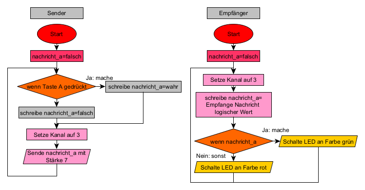 Wurden die beiden Programmablaufpläne auf je einen Calliope mini richtig programmiert, ändert sich beim Empfänger die LED die Farbe, wenn der Sender auf den Knopf A drückt.