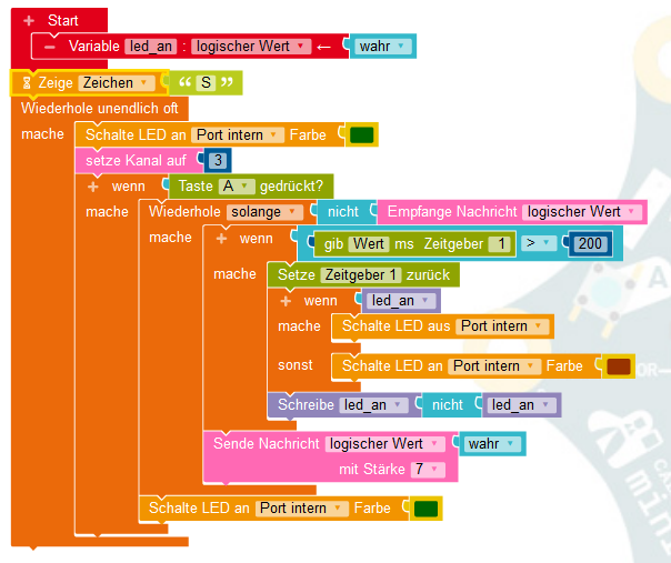Hinweis: Natürlich darf zum Blinken der LED nicht der Warte-Befehl verwendet werden. Während der Calliope mini wartet, reagiert er ja nicht. Deshalb kommt hier der Zeitgeber zum Einsatz.