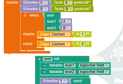Das Schaltbild realisiert die XOR-Funktion. Sie lässt sich mit der NAND-Funktion im Calliope mini nachbauen. Dabei sollte man beim Zusammenstellen der Blöcke von rechts im Schaltbild anfangen.
