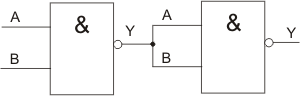 Für die NOT-Funktion werden die beiden Anschlüsse des NAND zusammengelegt. Am Ausgang Y steht immer das negierte Signal von A zur Verfügung.