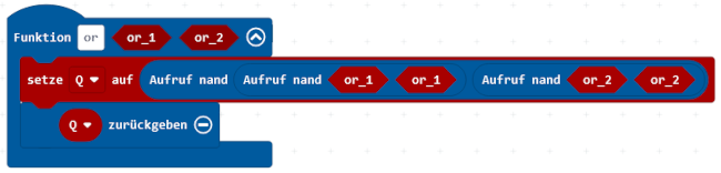 Die OR-Funktion wird durch eine nachfolgende Negation durch einen weiteren Aufruf einer NAND-Funktion zur NOR-Funktion. Da diese Funktion in einer folgenden Aufgabe für das RS-Flip-Flop benötigt wird, werden die Programmteile in einer extra Funktion mit dem Namen nor abgelegt. Als Ergebnis wird nur dann eine 1 angezeigt, wenn A und B 0 sind. In allen anderen Fällen erscheint eine 0. Überprüfen!