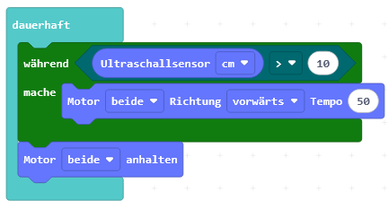 Der Calli:bot fährt, solange der Ultraschallsensor eine Entfernung meldet, die größer als 10 cm ist.