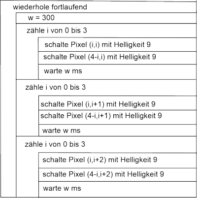 Aufgabe 3: Mit der Taste B sollen die drei LEDs in der mittleren Spalte für 2 Sekunden ausgehen und dann wieder in der ursprünglichen Helligkeiten aufleuchten.