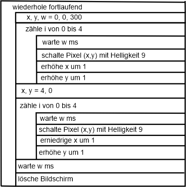 Aufgabe 4: Im letzten Programm fällt auf, dass bei der zweiten Linie von rechts unten nach links oben die mittlere LED eigentlich nicht mehr eingeschaltet werden muss. Ändere das Programm so, dass die mittlere LED in der zweiten Schleife nicht mehr eingeschaltet wird.