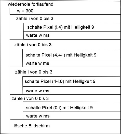 Aufgabe 1: Stelle den Programmablaufplan in ein laufffähiges Python-Programm um. Die Punkte wandern entgegen dem Uhrzeigersinn um das Display.