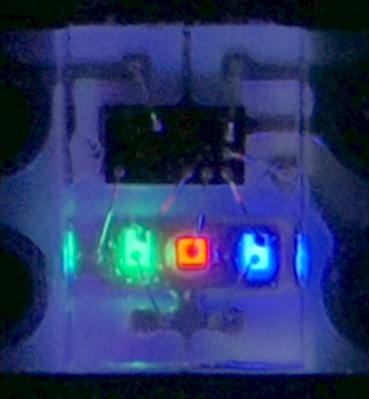 Jede der drei LEDs besteht eigentlich aus drei einzelnen LED. Jede dieser LEDs kann nur in einer Farbe leuchten: Rot, Grün oder Blau.